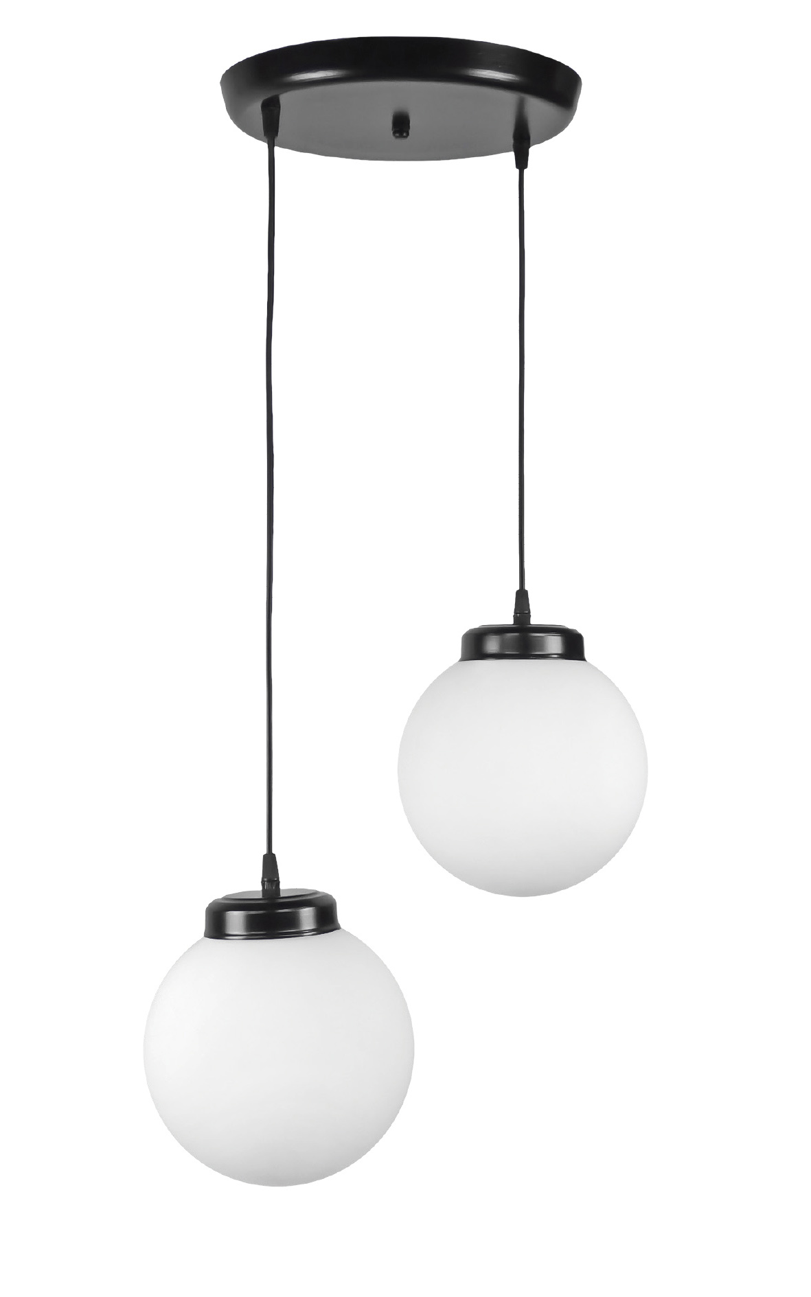 Οροφής φωτιστικό ανισόπεδο 2φωτο με μπάλες γυάλινες σε χρώμα λευκό και σκελετό μαύρο